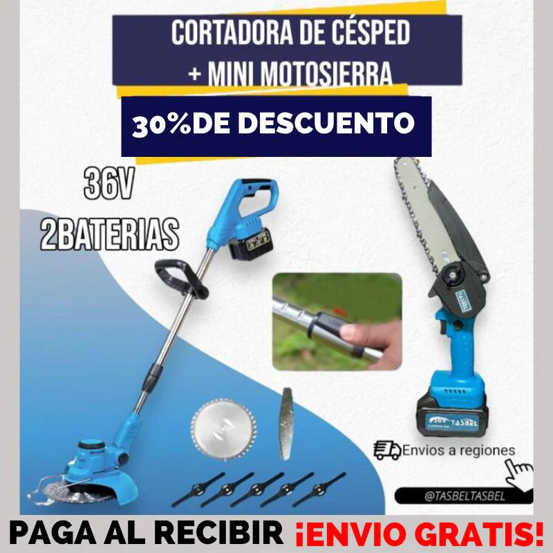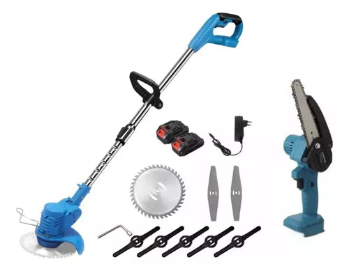 - ¡Este kit es increíble! La cortadora de césped deja mi jardín impecable y la minimotosierra es perfecta para podar. ¡Dos baterías recargables son un plus! ⭐⭐⭐⭐⭐- Ana P., Santiago.