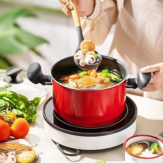 - Calidad: este increíble juego de utensilios de cocina de aleación de aluminio tiene una superficie antiadherente y resistente a los arañazos. Este conjunto de alimentos de alta calidad puede distribuir el calor de manera uniforme sin aceite adicional, para que pueda preparar comidas más saludables que toda la familia pueda disfrutar.